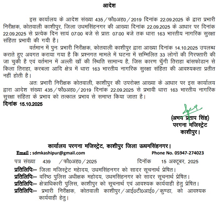 —-मौहल्लेवासियों ने ली राहत की सांस, प्रशासन का जताया आभार—- काशीपुर। बीती 21 सितंबर की रात्रि मौहल्ला अल्लीखां में आई लव मोहम्मद जुलूस के दौरान हुए बवाल के बाद प्रशासन द्वारा 22 सितंबर की सांय 7 बजे से प्रातः 7 बजे तक लगाई गई धारा 163 को प्रशासन ने वापस