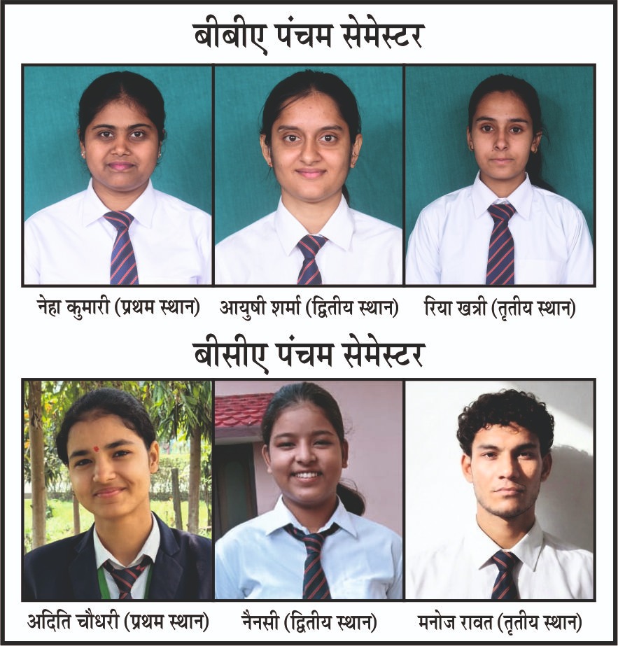 काशीपुर। बाजपुर रोड स्थित सत्येंद्र चंद्र गुड़िया इंस्टीट्यूट आफ मैनेजमेंट एंड लॉ कॉलेज के यूजी पाठ्यक्रम बीबीए,एवं बीसीए के विगत दिवस आए पंचम सेमेस्टर के परीक्षा परिणामों में संस्थान के विद्यार्थियों ने शानदार प्रदर्शन को दोहराया है। उक्त जानकारी देते हुए संस्थान की प्राचार्य डॉक्टर निमिषा अग्रवाल ने बताया कि बीसीए पाठ्यक्रम के परिणामों अदिति चौधरी ने सर्वाधिक 76.6 प्रतिशत अंक प्राप्त कर कक्षा में प्रथम स्थान प्राप्त किया वहीं नैंसी 74.8 एवं मनोज चौधरी 74 प्रतिशत अंकों के साथ क्रमशः द्वितीय एवं तृतीय स्थान पर रही। वही बीबीए पाठ्यक्रम में नेहा कुमारी ने सर्वाधिक 74 प्रतिशत अंकों के साथ कक्षा में प्रथम स्थान प्राप्त किया तो आयुषी शर्मा 71.1 प्रतिशत एवं रिया खत्री 70.4 प्रतिशत अंक प्राप्त कर क्रमशः द्वितीय एवं तृतीय स्थान पर रही। इसके अतिरिक्त शेष अन्य विद्यार्थीयों ने भी अपनी-अपनी कक्षाओं में शानदार प्रदर्शन किया है यहां बताते चले की पिछले कई वर्षों से संस्थान के विद्यार्थी लगातार अपनी मेहनत के बल पर कक्षाओं में शानदार प्रदर्शन करते हुए विश्वविद्यालय स्तर पर भी अपना नाम रोशन कर रहे हैं। विद्यार्थियों की इस उपलब्धि पर संस्थान की चेयरमैन श्रीमती विमला गुड़िया सहित समस्त प्रबन्ध समिति ने बधाई देते हुए उनके उज्जवल भविष्य की कामना की है।
